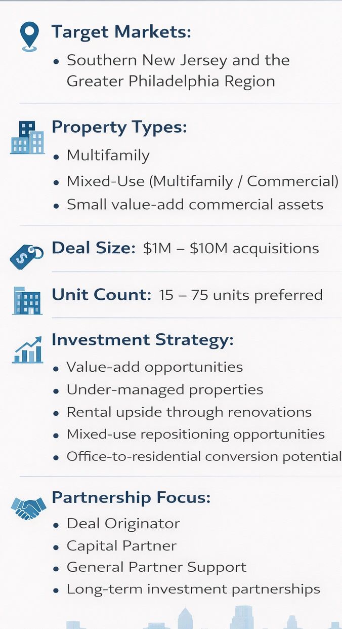 I focus on identifying value-add multifamily and mixed-use investment opportunities throughout Southern New Jersey and the Greater Philadelphia region. My primary interest is in properties where operational improvements, repositioning strategies, or redevelopment potential can unlock additional value.